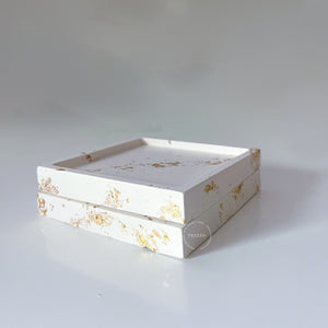 Trazzo White Gold Leaf Luxe Mini Dish; a stunning mini dish handcrafted with precision and care. Featuring a pristine white base adorned with 24k gold leaf details, this elegant piece is perfect for use as a candle tray, jewelry tray, or coaster.