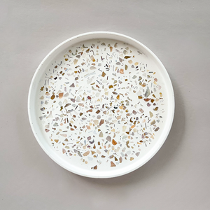 Elevate the aesthetic of your living space by incorporating Our Trazzo Naples Terrazzo Styling Tray. Exquisitely adorned with shimmering mother-of-pearl shells that are carefully inlaid and exposed through precise sanding, this tray exudes elegance. Its versatile design allows it to be placed in any corner of your home, whether it's the entryway, lobby, or living room. It also offers practicality as it can store everyday essentials such as remote controls, keys, or glasses. Expertly crafted from a premium eco-resin material, it can withstand high temperatures, making it ideal to hold hot beverages or candles for added ambiance.