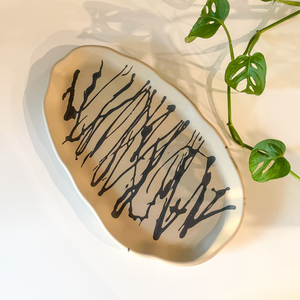 Introducing our handcrafted oval ruffle tray, featuring a chic splatter design. Made with sustainable materials, this versatile tray adds a touch of elegance to any space.
