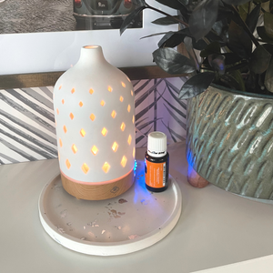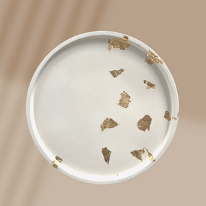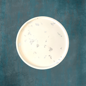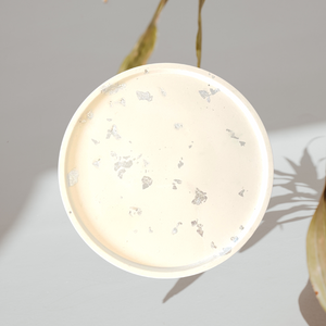 Decorative round tray in white with silver leaf foil details. Made with premium non-toxic, zero VOC eco-resin. Each piece is handmade in small batches and may feature slight differences in color as well as minor bubbles and brush marks.