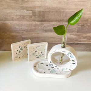 Smoky Pearl Treasures Collection, is a stunning array of home decor pieces featuring light blue and clear sea glass combined with black mother of pearl and pearl terrazzo.